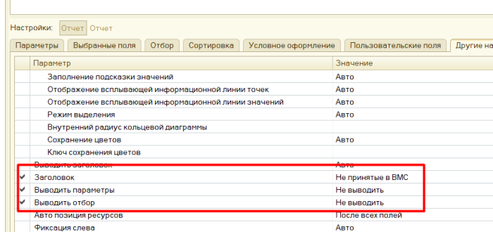 В настройках каждого отбора отключаем вывод параметров и отборов: